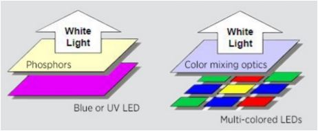 El recubrimiento de fósforo en el Led azul produce luz blanca y su temperatura de color puede cambiar en función del espesor de la capa de fósforo, cuanto más gruesa, más cálida. Por dicha razón se emplean actualmente dos tecnologías para obtener la luz blanca: la mezcla RGB o la cobertura química.